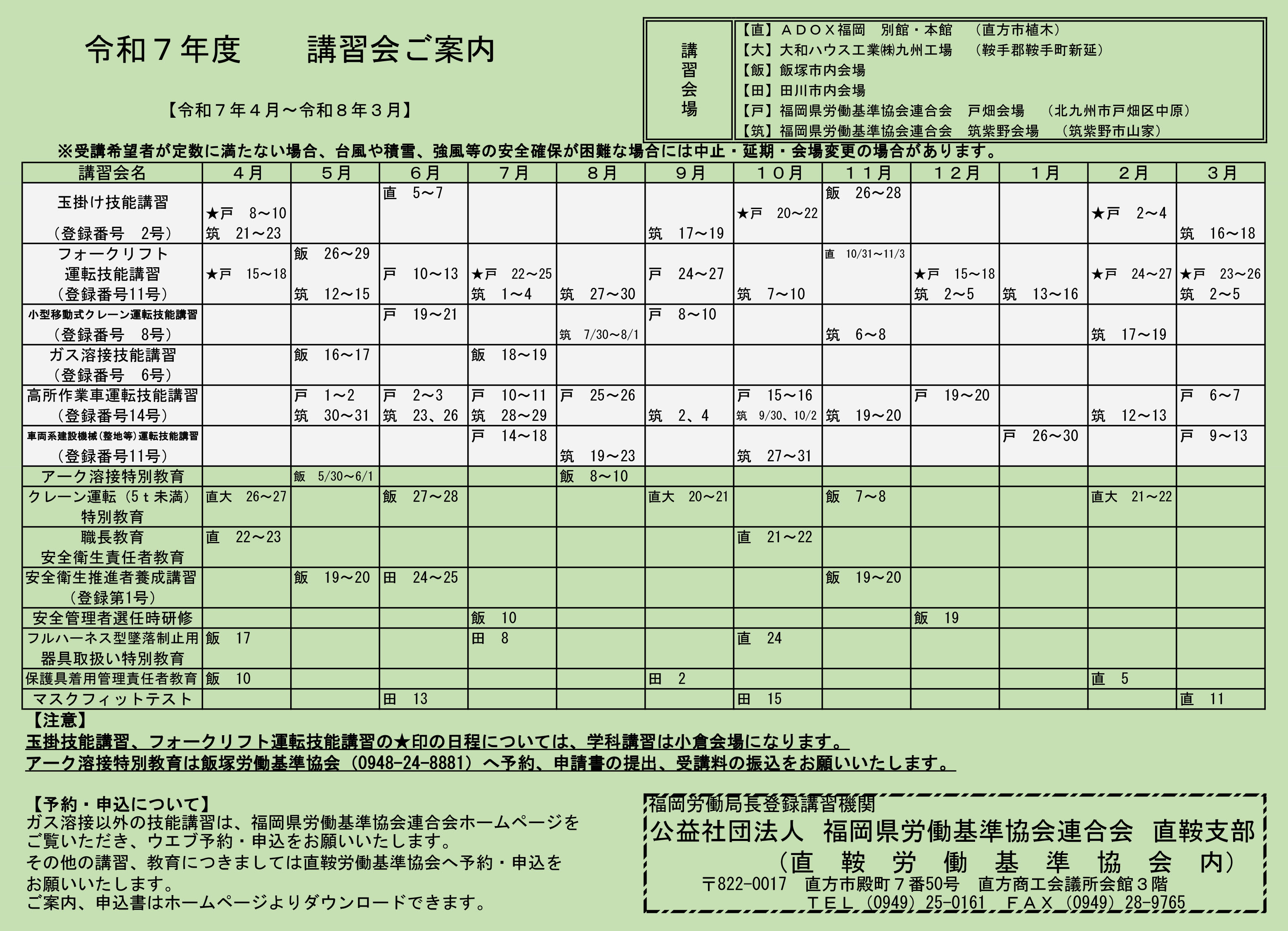 | ※技能講習(白抜)については福岡県労働基準協会連合会の受付となりますのでこちらから申し込みをお願いいたします。 |